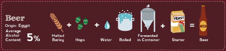 : Main ingredient is malt (Barley, wheat etc). Beer making process is known as brewing and the most common process involves fermentation of malted Barley.