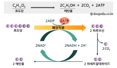 포도당을 담은 그릇에 효모를 넣고 뚜껑을 닫으면 미생물인 효모가 효소를 이용해 유기물인 포도당을 분해한다. 이때 뚜껑이 덮여 있기 때문에 산소를 통한 호흡이 불가능하며 무산소호흡이 이루어진다. 효모는 포도당을 완전히 분해시키지 못하고 에탄올을 만든다. 이러한 발효를 알코올발효라고 하며 알코올발효를 이용하여 막걸리나 맥주와 같은 술을 만들 수 있다. (≒ 양조)